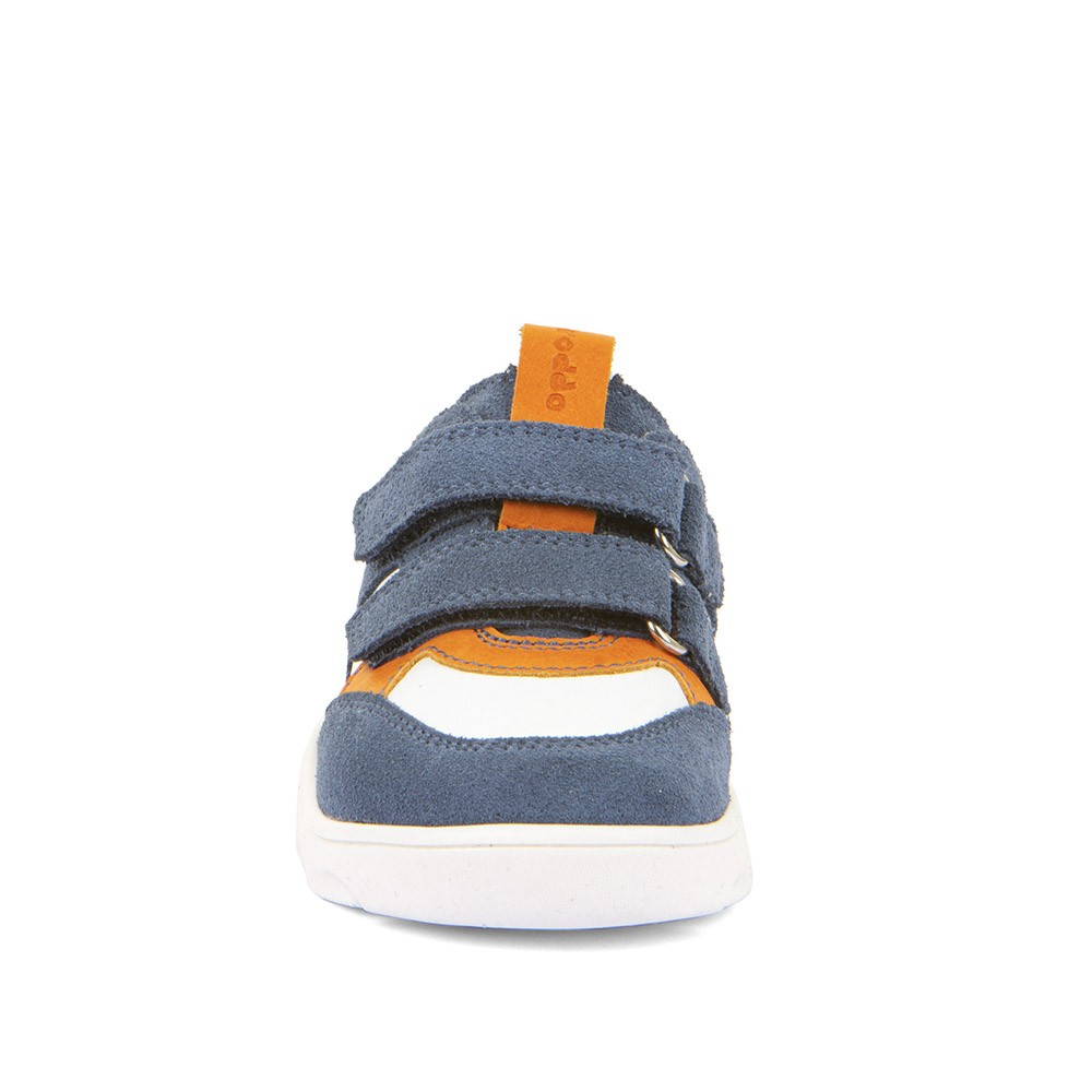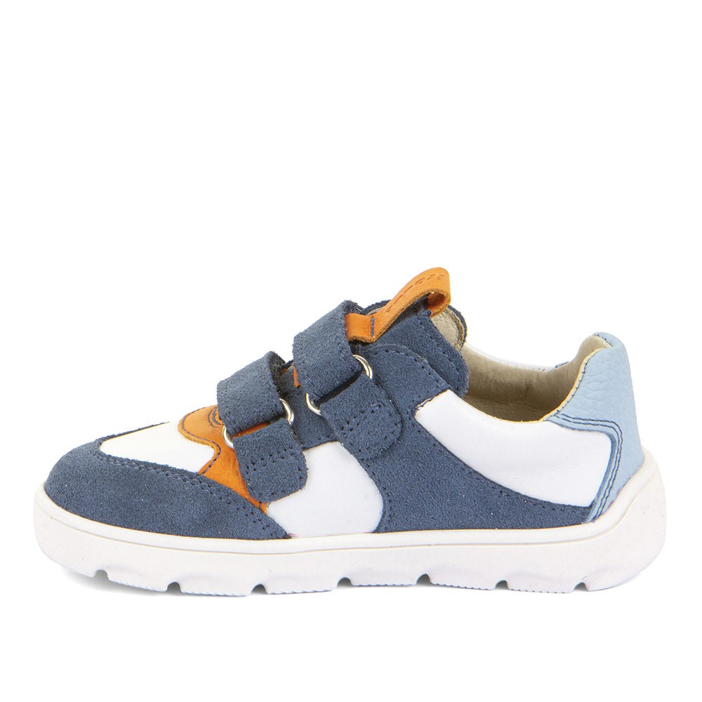 Step in to summer with Zeru Spring Barefoot trainers by Froddo. White leather uppers with accents of blue and orange in a soft nubuck. Double velcro fastening for easy on/off. Lightweight, durable outsole that is extra flexible, with zero heel drop. Chrome free leather lining with flat removable antibacterial microfiber insoles.